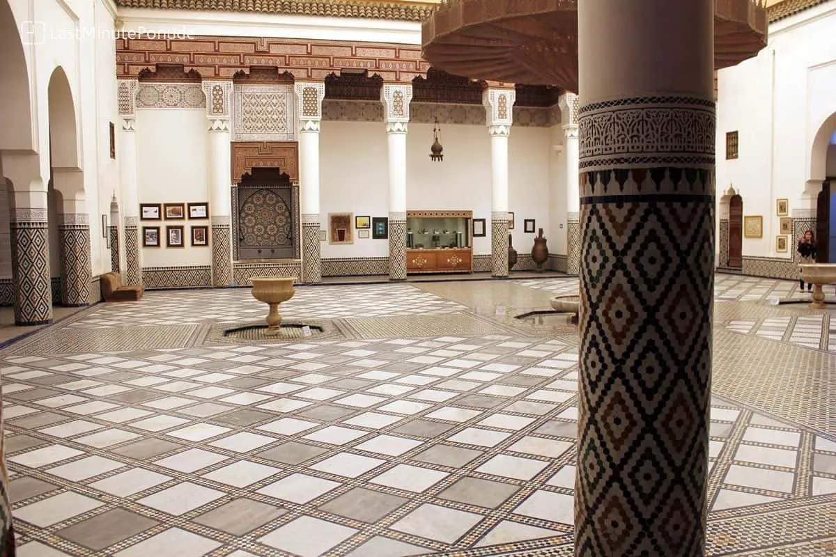 Doručak. Posle doručka odlazimo u baštu Mažorel (Jardin Majorelle), koju je stvarao francuski orijentalistički umetnik Žak Majorel tokom skoro četrdeset godina, a sadrži kubističku vilu koju je dizajnirao francuski arhitekta Pol Sinoard 1930-ih godina. Imanje je bilo rezidencija umetnika i njegove supruge, a osamdesetih godina prošlog veka imanje su kupili modni dizajneri Iv Sen Loran i Pjer Berže, koji su radili na restauraciji. Danas je kompleks vrta i vila otvoren za javnost. U vili se nalazi Berberski muzej, a 2017. godine u blizini je otvoren i Muzej Iv Sen Loran. Kada je Iv Sen Loran umro 2008. godine, kremiran je i njegov pepeo je razvejan u ovoj bašti. Ulaz u muzeje nije uključen u obilazak, ali je fakultativan prema individualnom ukusu. Marakeš je najstariji od četiri carska grada Maroka, drugi po veličini i nalazi se u centru plodne ravnice Hauz. Istorijski centar grada - Medina, uvršten je na Uneskovu listu svetske kulturne baštine 1985. godine. Marakeš je sredinom 11. veka osnovao Jusuf ibn Tašfin iz dinastije Almoravid i nazvan je Crvenim gradom zbog svoje živopisne medine utvrđene zidinama od naboja crvene gline. Razgledanje grada obuhvata: džamiju Kutubi iz 12. veka, letnji paviljon Menara, palatu Bahia, srce Medine, neobični trg Jema el Fna koji je takođe uvrštren u Uneskovu listu svetkog nasleđa. Slobodno vreme za ručak (nije uključen u cenu) u Marakešu u blizini medine. Uveče slobodno vreme za individualne aktivnosti i odmor. Moguće je u sopstvenoj organizaciji posetiti Le Fantasia - Chez Ali show, predstavu za dobar završetak marokanske fantazije. Večera. Noćenje u hotelu 4* u Marakešu.