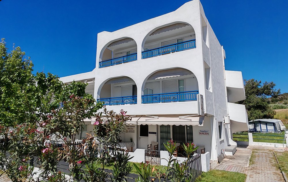 Nalazi se na oko 80m od plaže u najlepšem delu Kalamicija. Apartmani i studiji se nalaze u prizemlju, na prvom i drugom spratu. Svi studiji imaju SAT TV, signal za bežični internet i klima uređaj čije je korišćenje uključeno u cenu. Kuća ima i uređeno travnato dvorište sa zajedničkim roštiljem, kao i nekoliko parking mesta za goste kuće.