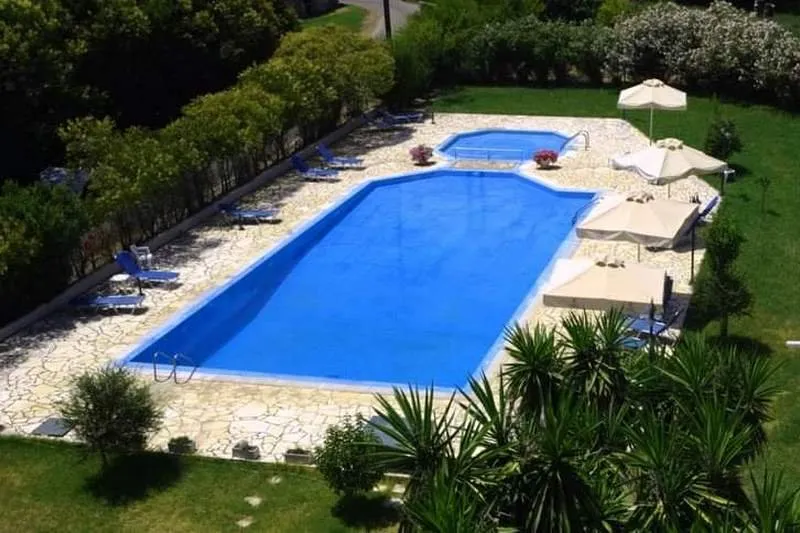 Nalazi se u samom centru Dasije, udaljena je oko 100 m od glavne ulice, odmah prekoputa hotela Ikos (nekadašnjeg Chandris hotela). Od plaže je udaljena oko 450 m. Ova lepo uređena i održavana apartmanska kuća sa velikim, uređenim dvorištem punim zelenila poseduje veliki bazen sa ležaljkama i suncobranima koji su gostima besplatno na raspolaganju. U blizini same vile su brojni kafe barovi, restorani, marketi, ambulanta i autobuska stanica. Vila u svom sastavu poseduje dvokrevetne studije, četvorokrevetne apartmane, kao i četvorokrevetne duplekse sa pomoćnim ležajevima raspoređene u prizemlju, na prvom i drugom spratu. Sve smeštajne jedinice opremljene su čajnom kuhinjom (štednjak sa dve ringle), frižiderom, kupatilo sa tuš kadicom, TV-om i klima uređajem (klima se doplaćuje 5 € po danu na licu mesta). U vili je dostupan WiFi, ali agencija ne garantuje za kvalitet signala i postojanost rada.