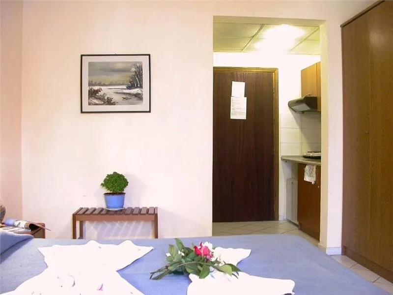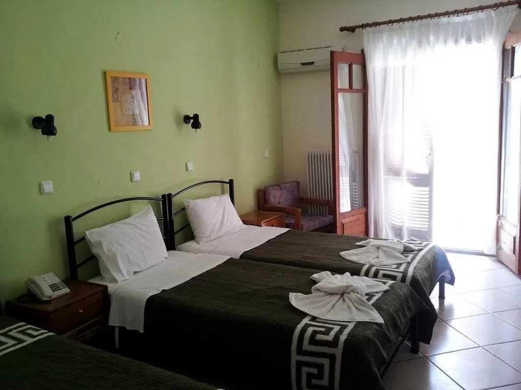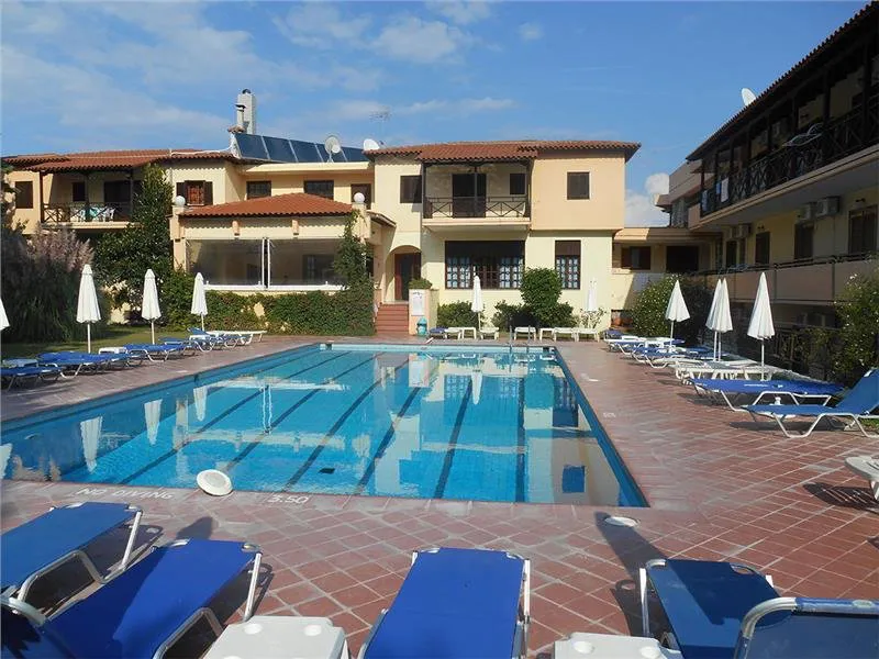 Nalazi se na ulasku u Pefkohori, na oko 300 metara od centra i oko 400 metara od plaže. Ima veliki bazen okružen mediteranskim zelenilom, bar na bazenu sa ležaljkama i suncobranima pored bazena (korišćenje ležaljki pored bazena se doplaćuje 3 € dnevno po odrasloj osobi kao min. obavezna konzumacija jednog pića iz bara hotela), restoran, TV salu i parking (broj mesta ograničen). U svom sastavu ima dvokrevetne i trokrevetne studije. Svaki studio ima kompletno opremljenu kuhinju, TV, klima uređaj (čije se korišćenje doplaćuje na licu mesta 6 € dnevno), kupatilo i terasu.