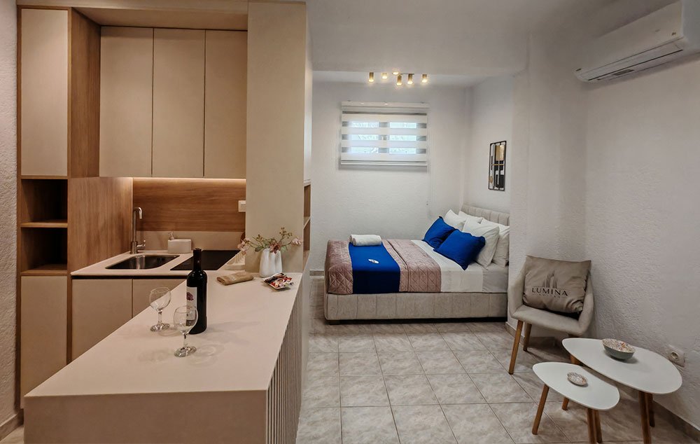Potpuno renovirana Lumina Suites nalazi se u najlepšem delu Psakudije na samo 90m od mora i blagom uzvišenju koje većini studija i apartmana pruža pogled na more. Kuća ima SAT TV, besplatan signal za korišćenje bežičnog interneta kao i klima uređaj čije je korišćenje uključeno u cenu. Sobe broj 3, 4, 5 i 6 su označene kao smeštajne jedinice sa izdvojenom terasom u cenovniku i umesto terase na raspolaganju im je letnjikovac gde će imati svoje izdvojeno mesto za stolove i stolice. Za period boravka do 7 noći organizovano je čišćenje i menjanje posteljina na pola smene, a za duži period boravka predviđeno je čišćenje i menjanje posteljine 2 puta u toku smene.