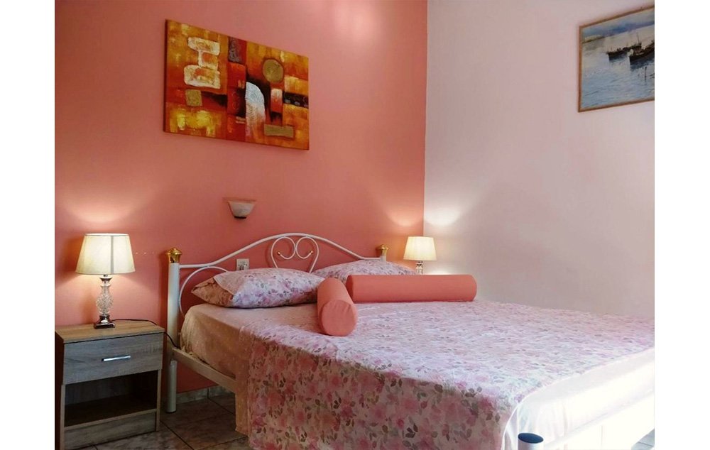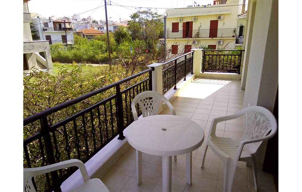 Vila Maria se nalazi u lepom mediteranskom vrtu, na idealnoj lokaciji, oko 800 metara od centra grada, na svega oko 170 metara od prelepe i jedne od najpoznatijih plaža na ostrvu, plaže Megali Amos (Velika plaža). Dvokrevetni i trokrevetni studiji vile Maria su smešteni na prvom spratu, a četvorokrevetni apartman na malo izdignutom prizemlju i svi su sa pogledom na dvorište. Opremljeni su klima uređajem (uključena u cenu), wi - fi Internetom i TV - om. Dvokrevetni i trokrevetni studiji sadrže opremljenu malu kuhinju sa delom za spavanje sa dva, odnosno tri standardna ležaja, kupatilo i lepu terasu sa garniturom za sedenje. Veličina studija je cca 18 – 20 kvm + terasa. Četvorokrevetni apartman se sastoji dnevnog boravka u kojem se nalazi dobro opremljena kuhinja (veliki frižider sa zamrzivačem, šporet sa rernom...) trpezarijski sto, ugaona sofa na kojoj može spavati dvoje dece do 12 godina, spavaće sobe sa francuskim ležajem, kupatila i velike terase sa garniturom za sedenje i pogledom na vrt. Veličina apartmana je cca 33 kvm + terase. Vila Maria je B kategorije, ima peškire i javni besplatni parking preko puta vile. Najbliži mini market je ispred vile, a autobuska stanica u neposrednoj blizini. Vila je idealna za mlade zbog blizine grada, ali i za porodice, jer je plaža u neposrednoj blizini, ima zidani roštilj i dvorište koje je na raspolaganju deci.