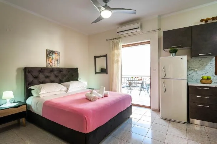 Vila Olga se nalazi u samoj luci u centralnom delu, tako da izlaskom iz Vile automatski ste na lepom šetalištu na kome se nalazi puno dobrih restorana, kafe barova, suvenirnica, prodavnica mešovite robe i svega što je potrebno za jedno lepo letovanje. Prizemni deo vile poseduje 3 studija koja su smeštena u zadnjem delu vile, tako da su zaklonjeni od celodnevne promenade ljudi, i smešteni su u lepom dvorištu punom cveća. Na prvom spratu se nalaze 2 studija od kojih jedan gleda na lepo dvorište, a drugi ima pogled na more sa strane, kao i dva apartmana sa direktnim pogledom na more i luku.