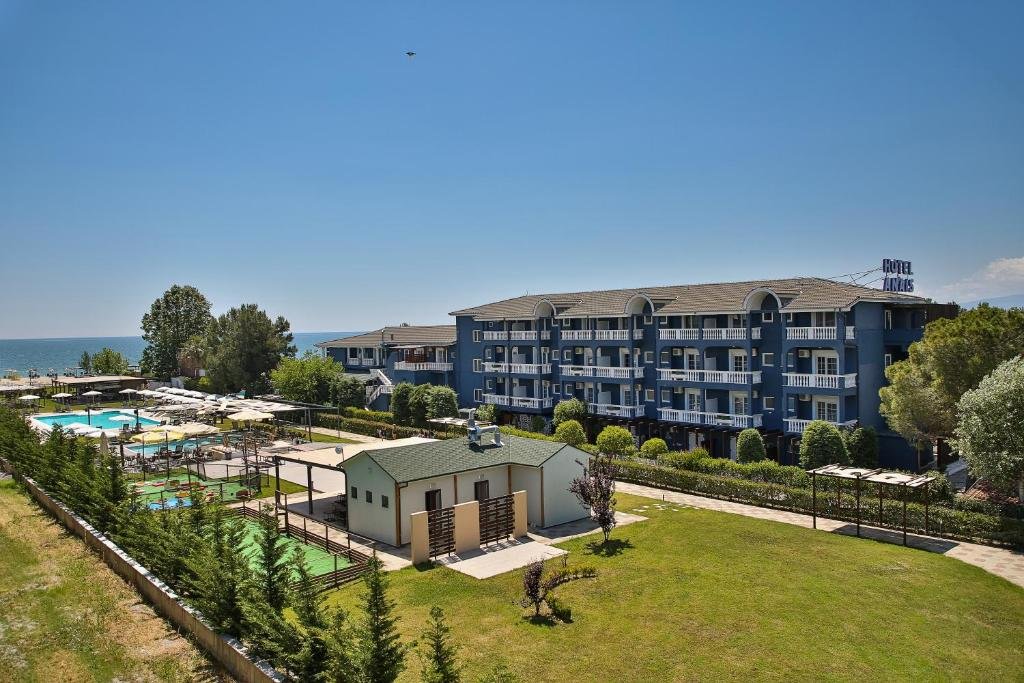 Olympios Zeus je smeštenu podnožju planine Olimp, u mesti Plaka Litohoro. Udaljen je oko 4 km od Litohora, 20 km od Katerinija i 118 km od aerodroma u Solunu. Sve sobe imaju kupatilo sa kadom ili tuš kabinom, klimu, sat TV, telefon, mini frižider, klimu, sef, balkon/ terasu. Hotel ima oko 100 bungalova, recepciju, restoran, bar, bazen na otvorenom, parking na otvorenom (besplatan), Wi-Fi u zajedničkim prostorijama hotela (besplatan), fudbalski i košarkaški teren bez opreme. Hotel se nalazi na peščano-šljunkovitoj plaži. Suncobrani i ležaljke se ne plaćaju.